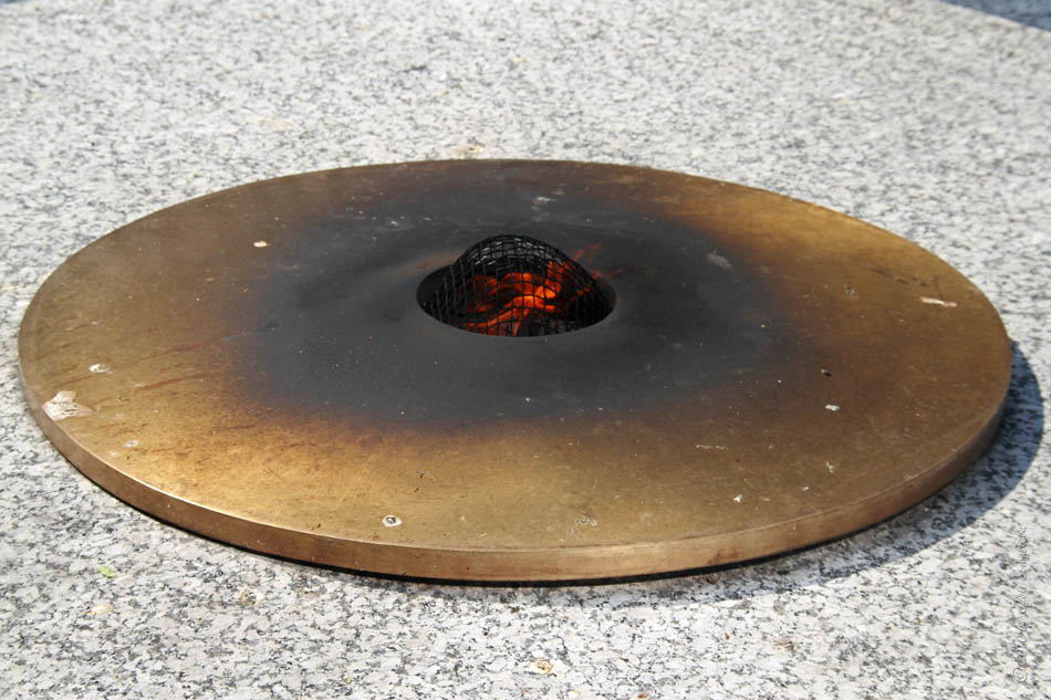 The Eternal Flame Memorial at Daley Plaza is a granite slab bearing a bronze circular disk containing a natural gas flame that burns perpetually. The inscription reads as follows: Eternal flame in memory of the men and women who have served in our armed forces. Army, Marines, Navy, Air Force, Coast Guard, National Guard, Reserves and Merchant Marines.